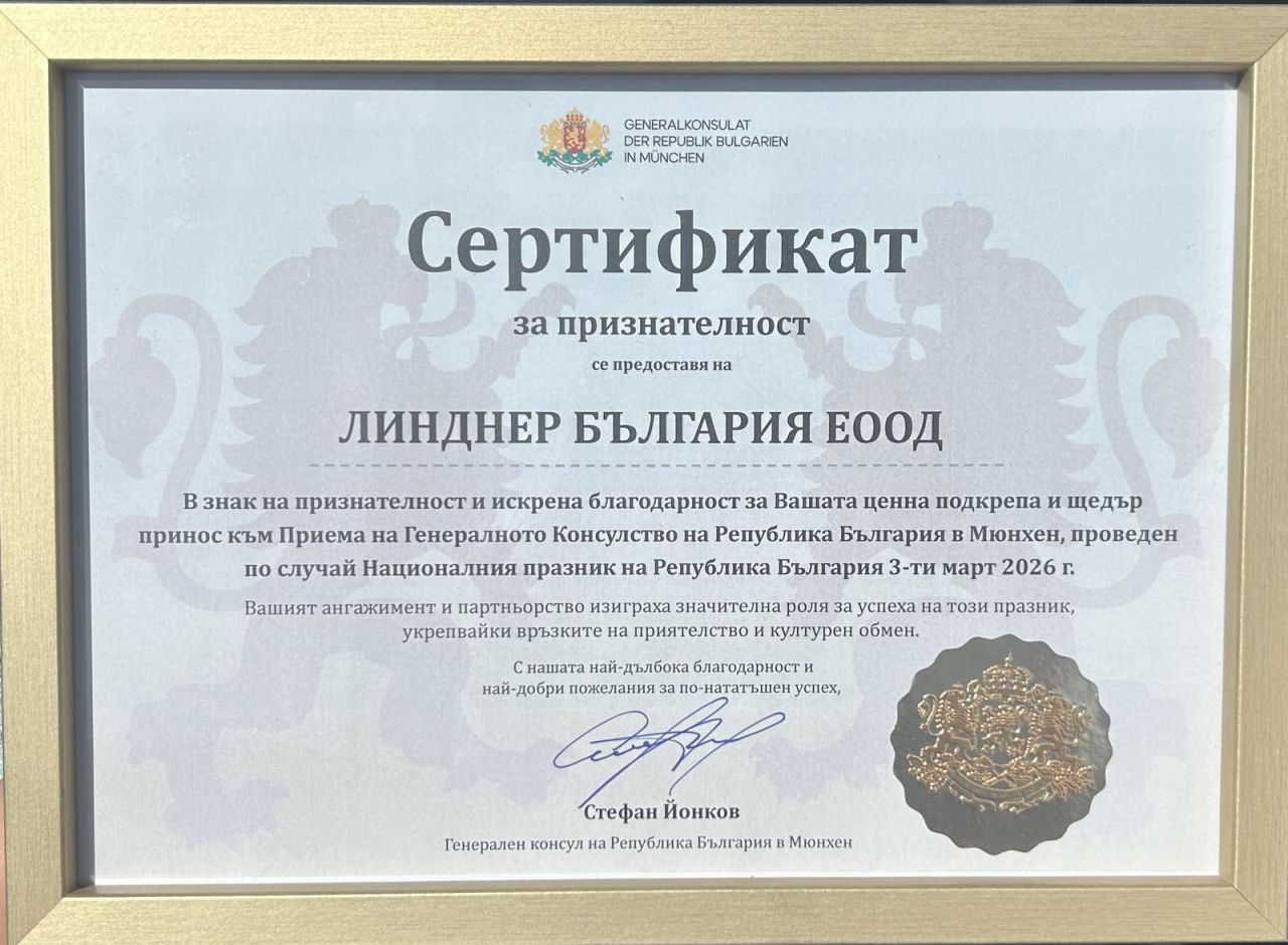 10-03-2026Тази година, на 3-ти март 2026г.,Линднер бе сред компаниите, оказали подкрепа и принос на Генералното Консулство на Република България в Мюнхен за отбелязване на Националния празник на Република България. Тържественото честване се състоя в културния комплекс „Гащайг“ в Мюнхен като по време на събитието сградата на „Гащайг“ бе осветена в бяло, зелено и червено – цветовете на българското знаме.Тържествената вечер бе открита с приветствие от генералния консул на Република България в Мюнхен г-н Стефан Йонков. На събитието присъстваха над 500 гости и приятели на България, сред които представители на Баварския Ландтаг, баварски държавни министерства и институции, консулския корпус в Бавария и Баден-Вюртемберг, представители на бизнеса, културните среди, както и многобройни представители на българската общност.